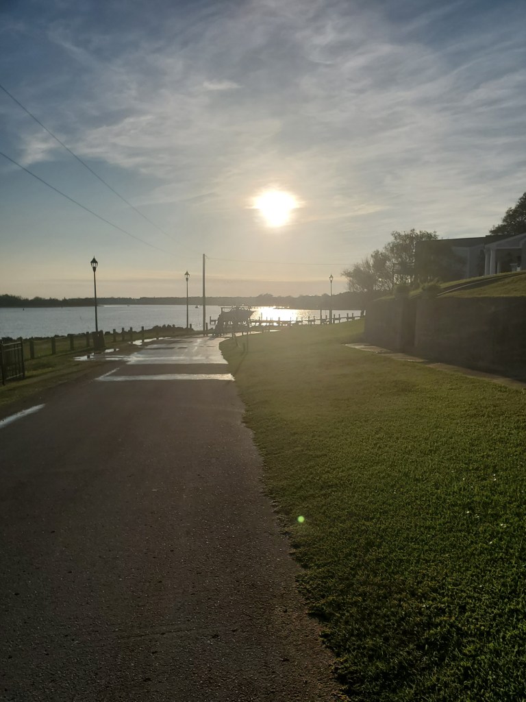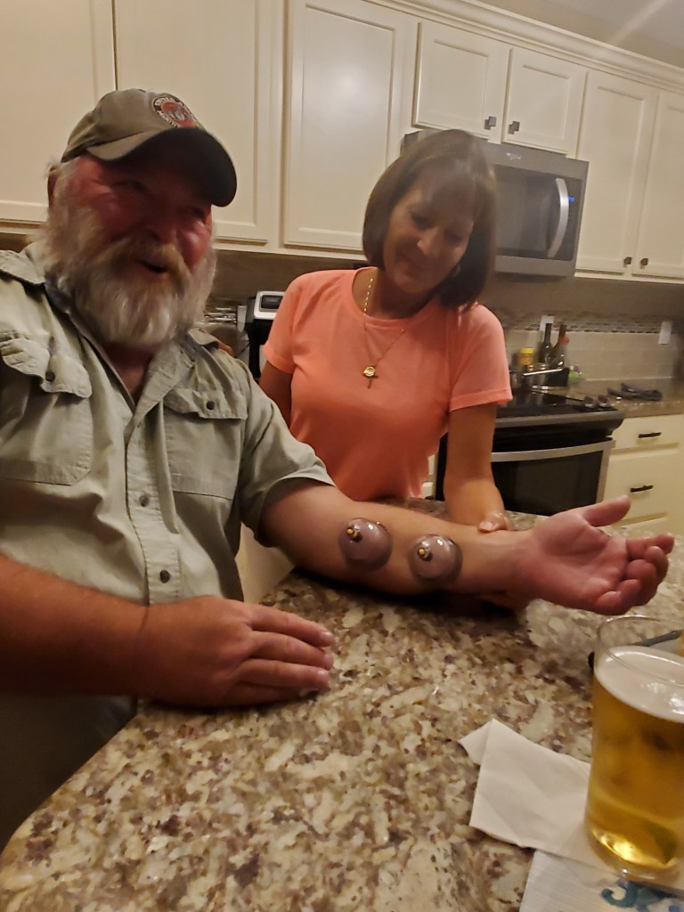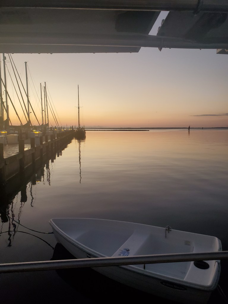 ICW Mile Marker 229 – We left Oriental as the sun was rising this morning to continue our journey south. A beautiful calm day with mirror-like waters. We had a beautiful day and there was so much to see today. We passed another large barge, went under bridges (one while the current was pushing us at 10 knots and narrow passage). We saw dolphins in Beaufort and many beautiful waterfront homes all along the way. One house had a Trump flag flying half mast. We ended our journey coming into a inlet with about 30 fishing boats due to a fishing tournament being hosted in Casper Marina where we were staying. Our friend Dan and Susan had us over to their new house in Swansboro for shower, food and drinks. My friend Susan cupped Bill. We will see if it helps him. We are hanging in Swansboro for few days to visit some friends and family.
